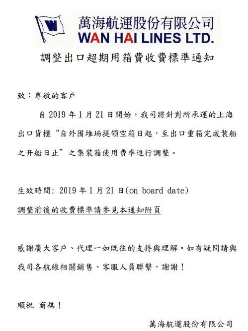 自2019年1月21日開始,將針對所承運(yùn)的上海出口貨柜“自外圍堆場提領(lǐng)空箱日起,至出口重箱完成裝船之開船日止”之集裝箱使用費(fèi)率進(jìn)行調(diào)整。